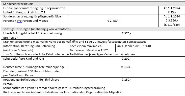 Auf der Landesflüchtlingsreferent:innenkonferenz im September 2023 wurde eine Erhöhung der Kostensätze für vulnerable Gruppen beschlossen: Unterbringung im EBB Bereich Erhöhung des Tagsatzes von € 48,- auf € 60,-, für Kinderflüchtlinge (umF) von € 95,- auf € 112,- und für Personen mit Pflegebedarf von € 2.480,-/Monat auf € 3.360,-/Monat. Ebenso wurde das transparente Realkostenmodell vorgestellt, welches zwischen Stadt Wien und BMI als Pilot starten wird. Mit dem Realkostenmodell werden die tatsächlich anfallenden Kosten in der Unterbringung abgerechnet, nicht wie bisher über einen gedeckelten Tagsatz/Pauschalbetrag. Für vulnerable Gruppen (EBB, Kinderflüchtlinge/UMF und Pflegeplatz) erfolgt die rückwirkende Verrechnung bereits mit 1.1.2023 und ab 1.1.2024 auch im Rahmen der Regelbetreuung. Berichterstattung hier, hier und hier sowie Information BMI.