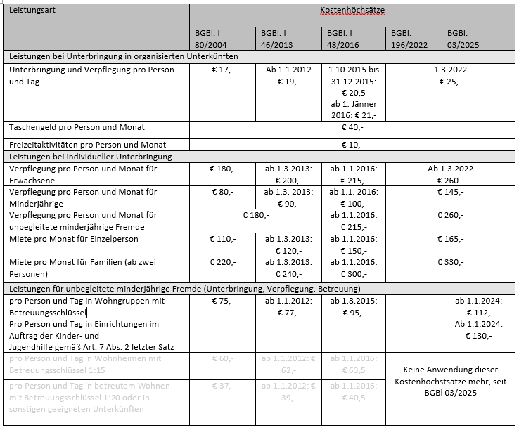 Seit Bestehen der GVV wurden die Tagsätze für die Betreuung von Schutzsuchenden (oder auch oft genannt Tagsätze/Kostensätze/Kostenhöchstsätze) nur 4x erhöht, siehe Tabelle weiter unten. Dies betraf vor allem den Tagsatz für die Betreuung die eine Organisation/Quartiergeber:in für die Unterbringung von Erwachsenen oder/und Minderjährigen pro Person erhält als auch die privaten Leistungen, die eine Person erhält, wenn er:sie privat wohnt. Alle anderen Leistungen wie Taschengeld, Freizeitgeld, Schulgeld, Bekleidungsgeld als auch die Kosten für einen Pflegeplatz sind seit 2004 nicht erhöht worden! Eine jährliche Valorisierung ist in der GVV nicht vorgesehen. Erhöhungen der Kostenhöchstsätze erfolg(t)en nicht aufgrund von betriebswirtschaftlichen Kalkulationen sondern aufgrund von Verhandlungen zwischen Bund und Länder, oftmals auf höchster politischer Ebene.